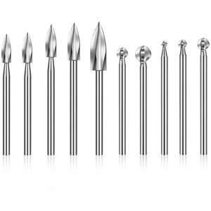 What you get: the package comes with 10 pieces/ 2 sets different engraving drill bit set, which are enough to use and help you make all kinds of crafts without breaking the wood for a beautiful and fluid craft effect material: our wood carving bits are made of high-speed steel, sturdy and solid, and anti-rust, these burrs are intended for faster wood removal, you can easily pare away woods much faster while leaving a smoother Applicable occasions: these wood carving bits can be widely applied in a variety of carving activities, perfect for engraving, drilling, beveling, chamfering, grooving, reaming, shaping, and hollowing Versatile compatibility: our drill bit is compatible with almost standard power drills, rotary tools and die grinders, especially effective in fluting flat surfaces, you just need to install it like any other typical drill bit and it's ready for some nice action Measurement: there're 5 different sizes of the carving drill bit, including . 3 x 3 mm, 3 x 4 mm, 3 x 5