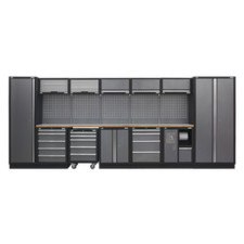 General description Tough and durable construction with a hammered metal finish, the Sealey Superline PRO® Storage System with Wood Worktop 4.92m is designed for heavy-duty use. It features aluminium handles and drawer pulls, ensuring both functionality and style. The drawers are fitted with ball-bearing drawer slides for smooth operation, and the system includes a robust 36mm pressed wood worktop. Technical specifications Model No.: APMSSTACK01W Worktop thickness: 36mm Modular Floor Cabinet 2 Door Full Height: 915mm Modular Wall Cabinet: 680mm (x3) Modular Wall Cabinet Tambour Front: 680mm (x2) Modular Cabinet 5 Drawer: 680mm Modular Floor Cabinet 2 Door: 680mm Modular Mobile Cabinet 5 Drawer: 650mm Modular Cabinet Multifunction: 680mm Modular Cabinet 4 Drawer: 680mm Modular Full Height Floor Cabinet: 600mm Modular System Double Upright Connector: (x4) Modular System Single Upright Connector: (x2) Modular Back Panel: 615mm (x5) Pressed Wood Worktop: 1360mm and 2040mm Other
