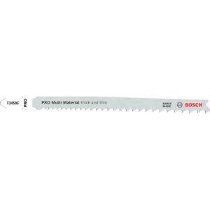 Lasts up to 5x longer than a Bosch T101B/T118B Jigsaw Blade When you cut wood, hitting a nail or screw can easily damage a standard jigsaw blade. But not the versatile PRO Multi Material thick and thin T345XF. We made it to help you get fast, straight cuts in workpieces of different thickness with standard-strength steel fasteners. The PRO Multi Material thick and thin T345XF is made from Bi-Metal: it has a high-speed steel (HSS) tooth strip bonded with a more elastic high-carbon steel (HCS) body for the hardness and flexibility you need to tackle wood and metal. The jigsaw blade’s milled, side-set teeth ensure you get fast cuts while the progressive tooth spacing allows you to cut a broad range of materials. The blade is 132 mm long, which means you can cut workpieces up to 65 mm thick. Fits all T-shank jigsaws Tested in Bosch labs according to Bosch standard procedures. Features and Benefits: • Lasts up to 5x longer than a Bosch T101B/T118B Jigsaw Blade • Fits all T-shank jigsaws • For long-lasting cutting of various materials, eg construction wood between 3 and 65 mm thick with standard-strength steel nails and screws, steel up to 10 mm thick, and wood-plastic composites • Highly effective for construction workers: long lasting and versatile Specifications: Material: BIM Tooth design: side set, milled Total length [mm]: 132 Tooth spacing [mm]: 2.4-5.0 Tooth pitch [TPI]: 5-11 Areas of application: Construction timber with nails (