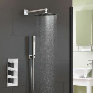 The mixer valve mounts on to the wall making your shower look less cluttered and bulky and the slim rectangular back plate neatly conceals all pipe work, adding an exceptional sleek finish. Featuring square dials with short levers for fingertip control, the mixer valve supplies water to 2 outlet diverters and is finished in stunning chrome, leaving a silky-feel surface and a highly reflective mirror like sheen, making your taps look new for longer. The thermostatic showering can be accessed via the 3 dial 2 way easy-to-operate dial controls - separate controls for temperature and flow; giving you full temperature control. A coordinating fixed overhead shower with a swivel joint and arm for ease of use and a handset shower come complete with the mixer valve tap. A fantastic 10 Year Guarantee. Thermostatic Concealed Valve Top dial - controls water to 2 outlet diverter Middle dial - on and off control Bottom dial - temperature control Manufactured from highly durable solid brass Finished