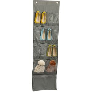 The shoe organiser with 15 compartments offers a practical and space-saving solution for storing shoes or other accessories. The foldable hanging organiser made of robust fabric is ideal for organising in the bedroom, bathroom or wardrobe. Thanks to the metal eyelets, the shoe holder is easy to hang on the door or wall and saves valuable space. The modern design blends into any interior and the transparent compartments allow for clear storage. Shoe organiser door in detail - Total dimensions H x W x D: approx. 158 x 47.5 x 5 cm - Internal dimensions of small compartment H x W x D: approx. 23 x 10.5 x 5 cm each - Internal dimensions of centre compartment H x W x D: approx. 23 x 21 x 5 cm each - Internal dimensions large compartment H x W x D: approx. 23.5 x 45.5 x 5 cm - Folded dimensions H x W x D: approx. 4 x 26 x 29 cm - Eyelet diameter: approx. 2 cm each - Load capacity: max. 5 kg - Weight: approx. 210 g - Materials: PU (plastic), PVC (plastic) - Colour: Grey, transparent Hanging