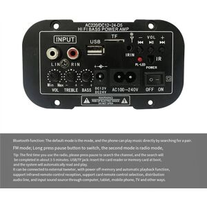 Support reading MP3 songs in TF card and U disk. Support adjustment of treble, bass and master volume. With AUX Audio input, can be connected to the computer, phone or CD. Dual Microphone input, adjustable reverb, built-in Bluetooth and FM radio. Support Wireless Microphone Board (not include.) Specification: Name: Amplifier Board Rate Power: 30W Plug Type:US Plug,it applies to Canada, India,Mexico, Thailand, the , the Philippines, and so on. voltage:AC110-220V Colour: Material:Iron+PCB The actual product may have slight color difference or difference, which not affect the use DC cable and speaker cable colors are random, don't accept the specified color Package Contents: 1 * Bluetooth Amplifier Board 1 * Remote control 1 * Speaker cable 1 * DC Power supply cable 1 * Power supply cable Only the above package content, other products are not included. Note: Light reflection and different displays may cause the color of the item in the picture a little different from the real thing. The