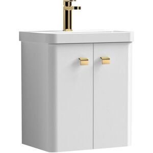 Curve Wall Hung 2 Door Vanity Basin - 600mm - Gloss White with Brushed Brass Drop Handles (Tap Not Included) Bring modern elegance and practicality into your bathroom with the Curve Wall Hung 2 Door Vanity Basin - 600mm - Gloss White with Brushed Brass Drop Handles. Its slim, thin-edge basin and smart storage make it ideal for cloakrooms, en-suites, or compact bathrooms. The gloss finish brightens your space, while the soft-close door ensures quiet, effortless use. Crafted with premium materials and a contemporary curved silhouette, the Curve range combines style and functionality in one smart solution. The slim ceramic basin maximises space without compromise, and the wall-hung design keeps floors clear for a sleek, uncluttered look. Soft-close hinges add durability and convenience, while an optional matching WC unit creates a fully coordinated, designer-inspired bathroom. For flexibility of choice, the tap and waste are sold separately. Product Highlights: Wall Hung Design: