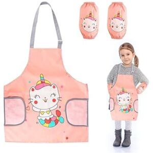 【Excellent Protection】: The waterproof children's apron and sleeves prevent oil and paint from staining your child's beautiful clothes. If your children enjoy activities like cooking and painting, you don't have to worry about difficult cleaning tasks. 【Durable Material】: The children's apron with pockets is made of high-quality polyester, which is waterproof, stain-resistant, and wrinkle-resistant. In addition, it is easy to clean and will not mold or rot. Durable, reusable, machine washable or hand washable, it is the best choice for mothers. 【Adjustable Design】: This children's apron has an adjustable design. The size of the apron is 54 cm long and 47 cm wide. The waist and neck circumferences can be adjusted according to your child's needs. It is easy to put on and take off and is suitable for children from 3 to 7 years old. 【Fashionable and practical】: The children's painting apron with a cute pink cat pattern is beautiful and popular with little girls. The coral fleece pocket is