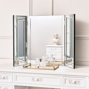 This Large Mirrored Dressing Table Triple Mirror is a simple yet stylish table top mirror perfect for placing on a dressing table chest of drawers or bathroom vanity unit. Made of wood and glass this mirror has a rectangular shape with a triple mirror design and a bevelled glass frame. Perfect for placement in a bedroom bathroom or dressing room space. A great gift choice for make up lovers or fans of vintage style and luxurious mirrored finishes. A pretty mirror choice for fans of mirrored decor and art deco style. Part of a large collection of table top mirrors available in a selection of styles sizes and designs. Want to see more items like this? Browse our mirrors category for more options. Colour: Mirrored Material(s): Wood Glass 90.5cm x 60cm x 2cm (width x height x depth)