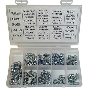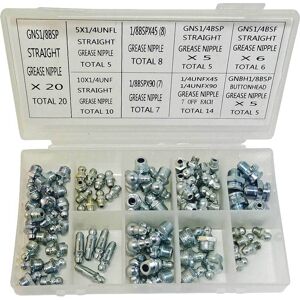 The Lumatic Selection Box contains 80 of the most popular metric grease nipples. The fittings are case hardened and plated, ZN3 zinc and clear, head forms conform to DIN 71412. Supplied in a handy clear case with labelled sections for easy identification. Contents: 20 x 1/8in BSP Straight.8 x 1/8in BSP 45° Angle.7 x 1/8in BSP 90° Angle.5 x 1/8in BSP Hook On.5 x 1/4in BSP Straight.6 x 1/4in BSF Straight.10 x 1/4in UNF Straight.5 x 1/4in UNF Straight Long. 7 x 1/4in UNF 45° Angle.7 x 1/4in UNF 90° Angle.Additional Information:• Grease Type: Nipple - Set• Pack Qty.: 80