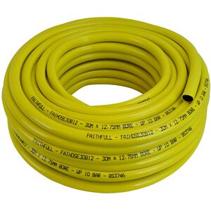 1 x Faithfull Heavy-Duty Reinforced Builder's Hose Length: 30m Diameter: 12.5mm (1/2in) The Faithfull Builder's Hose is a superior quality hose, ideal for worksite use. It is made from heavy-duty polyester, reinforced with a 24 braid fibre mesh for extra strength, making it both strong and flexible. The tough 3-ply construction is kink, twist and crush resistant, and highly resilient to UV light, frost, algae and is easy to clean. The hose is compatible with all 12.5 to 15mm or 19mm fittings depending on the bore size selected. The hose has a working pressure of 10 bar with a temperature range of -10 to +40°C. The bright yellow colour make this hose easy to spot on the worksite. Covered by a 5-Year guarantee. Available in 2 bore sizes of 12.5mm or 19.25mm for an increased flow rate.