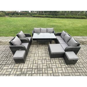 This rattan sofa set can accomodate 6 people and has a comfortable and soft back,made of high quality PE rattan and durable galvanized steel construction for sturdiness and long lasting.Durability ,and can be put outdoor all year round. Perfect set to sit round with your family and friends. Set Dimensions: 1 x Side coffee table 65L x 65W x 66H cm; 1 x Big footstool 65L x 65W x 34H cm; 1 x Lovesofa :124W x69Dx79H cm; 1 x 3 seater Sofa Size: 177W x 67D x 79H cm; 1 x Dining Table 140L x 80W x 69H cm; Dark grey mixed rattan with dark grey fabric .Color may Vary due to light or monitor .we are unable to return the item due to this problem .Please Consult Before Purchase if you have requirement on color saturation.the product is delivered on pallet,to kerbside only.