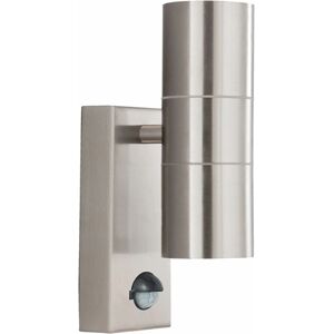 This Searchlight outdoor 2 light wall light is finished in stainless steel and comes complete with a motion sensor giving the user peace of mind as well as a stunning light.ᅠ This wall light is perfect for lighting any outdoor space including driveways or gardens and provides an upward and downward light.ᅠ The motion sensor can be adjusted for both time and distance, again increasing its versatility. Product code: 7008-2SS-LED FEATURES: * Finished in stainless steel * Motion sensor * LED * IP44 rated * Earthed SIZE: * Height - 215mm * Width - 69mm * Projection - Projection - 108mm BULBS: * Requires 2 x 7 watt max GU10 Halogen LED bulb - not included