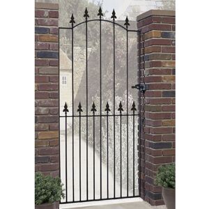 Pair of spear (fleur-de-lys) top arched metal driveway gates. They are heavy-duty high-quality driveway garden gates. The sizes listed are the total post-to-post gap that the gates will fit into, the hinge and latch gaps are already accounted for. The physical width of the gates is less than the listed width. The side shoulder height is 820mm rising to a central height of 1255mm on top of the spear finial. Electro-galvanized for added rust resistance and powder-coated black, the finish must be inspected and any chips touched up. The galvanizing is not a 100% rustproof guarantee. Like any outdoor metal product, it may need to be painted every couple of years to ensure a long life. Moving parts will need to be touched up regularly. It has angle brackets, bolts, a rocker latch, and a drop bolt, but no screws. Nuts and bolts must be painted after fitting to prevent the onset of rust. Made from solid metal frames 25mm x 10mm and infill bars 12mm diameter. Search Wayfair for optional Lepine 70mm square x 1400mm long concrete-in metal posts available to purchase. Rosalind Wheeler Size: 213cm W X 125cm H