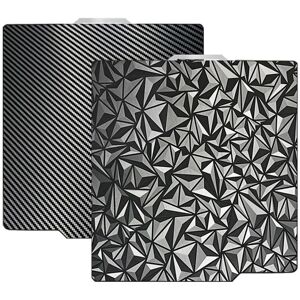 [Upgraded build plate]Double-sided Big PEO+PET spring steel plate,One side is upgraded big PEO film .big PEO looks like countless diamonds on the ,which make your eyes light up.The other side is smooth PET.the bottom of the printed model is smooth.One build plate has two beautiful patterns. The bottom of the prints leave a pattern. [Excellent adhesion for first printing layer]The model can be firmly attached to the of the print bed.Easily print even for a newbie. Please let the build plate cool down before remove the model to avoid damaging the coating. [ Easy to Remove]The spring steel sheet can be bent to remove the model quickly, without the help of other tools. And the plate return to flatness. [High Resistance and Compatible Filaments]The big PEO print bed is resistant to high temperature 150℃ and smooth PET coating bed is 150℃. After our extensive testing, we recommend big PEO+PET to print PLA / TPU /PETG,If you want to print other filaments, please adjust the parameters.
