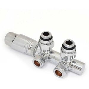 Features and Benefits: Twin radiator valve Manufactured from high-quality material and is extremely durable for long-term use Solid brass construction Comes in attractive Chrome finish Compression Inlet(s) 15mm Valves come with Decorators Caps which are used to fully isolate valves Radiator Coupler 1/2" BSPT - Male One wheel head and lockshield in one body TRV's are installed on the flow rather than the return pipework of a radiator Used in conjunction with a system automatic bypass valve This thermostatic valve can be installed on either the flow or return in any orientation System automatic bypass valves are a specific building regulation requirement for all new installations and boiler upgrades All bi-directional TRV from any manufacturer require the bypass valve to function correctly and thus avoid radiator hammer Important Information: Supplied with 2 year guarantee from the manufacturer Radiator Valves Type Thermostatic Position Angled Radiator Valve Connection Size 1/2 BSP