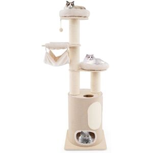 Provide Your Cat with the Ultimate Retreat! Our wooden cat tree measures 58 x 58 x 187 cm (L x W x H) and comes with 6 tiers, providing spacious activity spaces for your lovely kitten. It boasts a 2-story cat condo that is artfully crafted with accessible cat holes on each layer and additional entry points at both the top and second floors, ensuring your pet can enjoy both seclusion and interactive play. Moreover, your feline can bask in the comfort of 2-style hammocks or reign over their domain from 2 luxurious perches with soft padded cushions. Meanwhile, the tree caters to their instinctual need to scratch with sisal scratching posts, a scratching mat, and a hanging sisal ball. Thanks to the 14 cm thickened supporting columns and a solid plywood frame, the cat climbing stand is safe and stable enough for your cat to stretch and play energetically. Give your cat the ultimate blend of comfort, fun, and durability with our wooden cat tree.