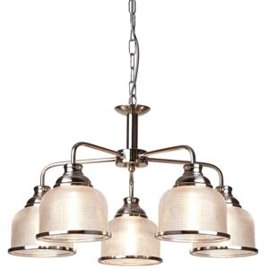 This Searchlight Bistro II five light multi arm ceiling pendant light is finished in satin silver and comes complete with glass shades.ᅠ This stunning light is suspended on a chain and the ribbed acid glass shades and five silver arms make it a striking light.ᅠ It would look equally incredible in a cafe or bar, or indeedᅠ over a kitchen worktop or island. Product code: 1685-5SS FEATURES: * Finished in satin silver * Matching items available and also finished in antique brass (please see website) * LED * Class 1 earthed SIZE: * Drop - 880mm * Height - 340mm * Width - 540mm BULBS: * Takes 5x 7 watt E27 LED Bulbs - Not included.