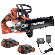 Big power in a small package: Black & Decker's GKC1820L20 chainsaw combines a short 8" bar with a high performance motor and lithium ion battery power. Where larger chainsaws can prove difficult to use above shoulder height, the GKC1820L20's lightweight construction makes it ideal for otherwise trying pruning tasks, as well as any other light duty woodcutting tasks you have in mind. The GKC1820L20 is energy efficient too - a 2ah lithium Ion battery will power the chainsaw for an average of 150 cuts per charge. Use is kept comfortable by a rubber overmoulded, textured rear grip, a large wrap-around side handle & balanced weight distribution throughout the tool. Other benefits include the GKC1820L20's lock off safety switch, which prevents accidental starting, its smooth cutting anti-kickback chain, & an automatic, leak free oiling system. Specifications • Battery Voltage: 18v • Battery type: Lithium Ion • Interchangeable Battery: Yes • Non slip grip: Yes • Cutting Width: 16 cm • Bar length: 20 cm • Safety lock off switch: Yes • Chain Speed: 3.1 m/s • Chain type: Anti Kick-Back • Oil-tank capacity: 25 ml • Weight: 2.3 kg Features & Bebefits • Fast and hassle free solution to pruning branches and light-duty woodcutting • Battery powered - no danger of cutting the cord and no harmful emissions • Lightweight for improved comfort in use and manoeuvrability • Long lasting lithium ion battery technology • Lightweight for improved comfort and manoeuvrability • Non-slip grips for a secure and comfortable hold Contents • GKC1820L20 18v Cordless Chainsaw • 1x 4ah Lithium ion Battery • 1x Battery Charger