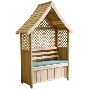 Zest Norfolk Arbour Wooden Garden Seat & Storage Box Trellis A striking and stylish garden feature made from strong, pressure treated timber which will add a focal point to your outdoor space. Its classic elegant design means it will complement any garden. The traditional pointed roof will shade you from the sun while the trellis sides allow the breeze pass through while you sit back, relax and take in your surroundings. The Norfolk Arbour is a beautifully designed product perfect for those who enjoy sitting in the sun with some shelter. Underneath the seat is a handy storage box for you to store your cushions and other garden items safely. With a 10 year guarantee you can be sure it will be a stunning focal point for years to come. Elegant, sturdy PEFC certified wooden construction. Pressure treated for durability. Includes Stone Seat Pad Classic stone coloured, fibre filled seat pad made from polyester fabric. Designed to be comfortable, durable and showerproof. The cover can be