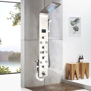 Features: LED water flow, shower head and temperature display to help you choose the most suitable water temperature, multi-output switch to control multiple water effects combined, this shower panel is equipped with LED waterfall, rain shower head, telephone shower, water outlet bathtub, massage jet and spray gun. One can meet your multiple needs and bring you a comfortable day. Material: thick nickel-plated 304 stainless steel, brass fittings, anti-corrosion material and explosion-proof pipe make this shower panel an upgrade. The brushed nickel appearance in European and American style, multi-layer electroplating through a 48-hour acid salt spray test, can easily cope with wet and corrosive toilets. Details: the mixture of hot and cold water makes for a convenient bathing experience. The pressure balancing coil monitors the water pressure balance to avoid scalding from sudden changes in hot or cold water pressure. The LED shower head panel is smarter and more environmentally
