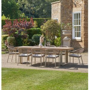 Introducing the Aveneil 8-Seater Outdoor Dining Set – a perfect blend of modern design and premium craftsmanship, proudly made in Vietnam. This stunning dining set brings together a harmonious mix of high-quality materials, creating an elegant yet durable addition to your outdoor space. The rectangular dining table features a beautifully crafted top made from environmentally friendly acacia wood with a light teak effect, offering a natural look with a contemporary twist. Complementing the wood, the sleek latte-coloured powder-coated aluminium frame is both stylish and robust, while the woven polyrope details in a natural wheat colour adds texture and visual interest. Designed to withstand the elements, this set is low-maintenance, weather-resistant, and resistant to fading and stains – ensuring it will remain a striking focal point in your outdoor area for years to come. For optimal protection, we recommend using an Aerocover when the set is not in use, preserving its pristine appearance and longevity. Additionally, this dining set comes with the peace of mind of a 3-Year Structural Guarantee, ensuring long-lasting quality. George Oliver