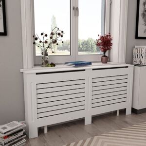 This wooden radiator cover is designed to give your radiator a decorative function and some additional shelf space. Solid pine wood: Solid pine wood is a beautiful natural material. Pine wood has a straight grain, and the knots give the material its signature, rustic look.Practical shelf: The heater cover has a shelf for placing your books, photo frames, ornaments, etc.Modern slat design: The radiator cabinet features a modern slat design that fits perfectly with any decor. Note:Each product comes with an assembly manual in the box for easy assembly. Colour: White Material: Solid pine wood Dimensions: 210 x 21 x 85 cm (L x W x H) With horizontal slats