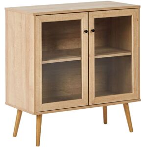 Cabinet with Glass Front. Enhance your space with this stylish and functional sideboard. Made from easy-to-maintain materials, it stands on sturdy wooden legs for a natural touch and features a sleek tempered glass for a modern look. Behind its two doors, a spacious shelf provides ample storage, making it a perfect blend of elegance and practicality for any interior. Details: Product Type: Display Cabinet Style: Minimalist General Color: Brown Material Type: Engineered Wood Main Material: Particle Board Additional Material: Pine Wood Frame Material: Engineered Wood Legs material: Wood Top Material: Engineered Wood Doors Opening: Standard Drawers: No Finish: Veneered Leg Caps/ Pads: No Number of Doors: 2 Shelves: Yes Dimensions: Depth: 40 cm Width: 80 cm Height: 84 cm Weight: 20 kg Top Weight Capacity: 30 kg Offer Includes: 1 x Sideboard Key Features: Wood-like Finish for Natural Look, Minimalistic, Scandinavian Style, Perfect for Both a Bedroom and a Living Room, Stable and Durable