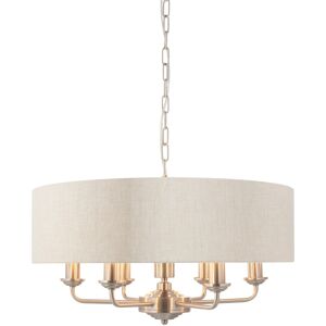 Endon Lighting 94357 Highclere 6 light ceiling pendant light is a sophisticated combination of Natural linen fabric with a reflective brushed metallic inner and Brushed Chrome metalwork. This statement light is the perfect timeless addition to modern and classic homes. FEATURES * Ceiling pendnat light * Brushed Chrome finish * Natural 100 % linen mix shade * Metallic inner shade * 6 bulbs (sold separately) * Comes with 1 m of chain and cable * Dimmable * Earthed * IP20 * Height adjustable at the point of installation SIZE * Height: 350-1200mm * Shade height: 150mm * Shade diameter: 550mm BULBS * Takes 6x40 watt (max) Small Edison Screw (E14) Candle Lamps - NOT INCLUDED * IDEAL FOR USE WITH LED LAMPS ORDER CODE - 94357