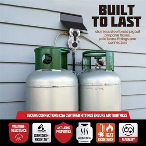 [Two-Stage Automatic Conversion Propane Gas Regulator]This two-stage regulator can be connected to two propane tanks. It allows empty tanks to be removed and refilled without interrupting the propane supply. For RVs with dual propane tanks, when the primary tank is empty, it automatically switches to the backup tank and the indicator light changes color to let you know the tank is depleted and needs to be replenished. [Specifications]RV Propane Regulator: Main tank capacity 210,000 BTU/hour, backup tank capacity 130,000 BTU/hour. Inlet is 1/4inch SAE reverse flare and outlet is 3/8inch female NPT. RV Pigtailed Propane Hose: 1/4inch inverted flare fitting and QCC1 connector (not 1/4inch NPT threaded). If you order, please check your connector before use [2-Pack 18-Inch Metal Braided 1/4-Inch Inverted Flared RV Pigtailed Propane Hose with Pressure Gauge]1/4-Inch Inverted External Flared Metal Braided RV Propane Pigtailed Hose to 1/4-Inch Inverted External . (Not 1/4inch male NPT. Please