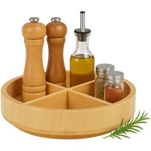 The rotating tray with 4 compartments helps you keep your worktop or kitchen cupboard tidy. The kitchen turntable is ideal for the organised storage of spices and sauces, but it also works well as a bathroom organiser for cosmetics. Thanks to the rotating design, you always have easy access to the contents. The dividers can be removed so that even larger containers can be stored easily. Turntable in detail - Dimensions H x D: approx. 6 x 23.5 cm - Material: bamboo, foam - Colour: natural Rotating spice tray made of bamboo - For kitchen cupboards and worktops – also ideal for the dining table - Convenient storage for spices, oil, vinegar, sauces, etc. - 360-degree rotation for quick and easy access to contents - 4 compartments – flexible design with removable dividers - High edge of the rotating plate prevents slipping and falling - Made from bamboo, bringing a natural touch to the kitchen - Foam pads ensure a non-slip base and protect against scratches - Also suitable as a bathroom