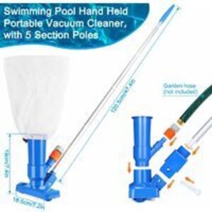 【PORTABLE POOL VACUUM】 The pool jet vacuum is made of high-quality ABS plastic to ensure maximum durability. Its bottom is equipped with 3 brushes and 2 wheels for easy cleaning. 【EASY TO USE】 It is designed with a 5-section handle, a fixed scrub brush, and a cleaning mesh bag. Unique design, easy to clean and carry. Ideal for cleaning swimming pools, spas, hot tubs, ponds, fountains, etc. Saves water, no need to empty the pool to clean it. 【APPLICATION】 The pool vacuum works well for quick pick-up spots in swimming pools and in small bodies of water like above-ground pools, wading pools, ponds, fountains, spas and water features. 【WORKING PRINCIPLE】 This easy-to-assemble underwater cleaner is simply powered by water pressure from a garden hose (not included). The water from the hose enters the vacuum and creates a suction effect. This could work well for quick leaf pickup in the pool. 【PACKAGE INCLUDING】 1 * Vacuum Nozzle, 1 * Mesh Bag, 1 * Quick Connector, 1 * Buckle, 5 * Pole