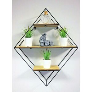 COLOUR AND MATERIAL: Black Metal Frame and Natural Wood Effect 3 Tier Platform. DIMENSIONS: 41cm x 50cm x 12cm (Width x Height x Depth) STYLE: Industrial and Modern. Floating Wall Mountable Sleek Black Metal and 3 Tier Wooden Shelves.Diamond Rhombus Shaped. Create a stylish way to show off all your ornaments, miniature plants and knick knacks. This stylish display unit will work anywhere in your home with its modern, minimal look. USE: Use this Floating Shelf as a Picture Ledge and display your favourite memories. From ornaments and trinkets to pot plants. The choice is yours. WHERE TO HANG: The Metal Frame gives the Floating Shelf an Aesthetically pleasing look that works well in any Bathroom, Bedroom, Hallway or Living Room. The chic modern rhombus look fits the unit into any home.