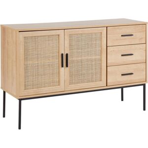 Wicker Front Cabinet with Storage. Storage cabinets no longer have to be unified and monotonous. This natural rattan two-door sideboard stands out, bringing a large dose of boho style to your living room. The piece offers three capacious drawers and two shelves that can be used to store away clothes, textiles or other accessories. The black metal legs add some colour contrast, while also providing robustness and longevity. Details: Product Type: Sideboard Style: Boho General Color: Brown, Black Material Type: Wood Main Material: Particle Board Additional Material: Rattan Frame Material: Engineered Wood Legs material: Metal Top Material: Engineered Wood Doors Opening: Push-to-Open Drawers: Yes Finish: Veneered Leg Caps/ Pads: No Number of Doors: 2 Number of Drawers: 3 Shelves: Yes Dimensions: Depth: 39 cm Width: 120 cm Height: 77 cm Weight: 32 kg Drawer Weight Capacity: 5 kg Shelf Weight Capacity: 15 kg Top Weight Capacity: 30 kg Offer Includes: 1 x Sideboard Key Features: Wood-like