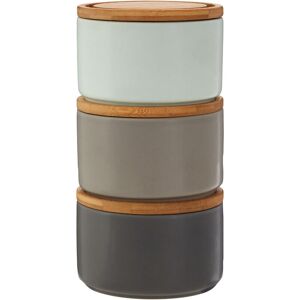 These canisters are made from smooth and durable dolomite. Two shades of grey are coordinated with pale blue to produce a muted colour array. Their eco-friendly bamboo lids have an airtight seal, ideal for keeping food fresh. The base of each canister is ridged, allowing them to slot securely into the grooved bamboo lids.