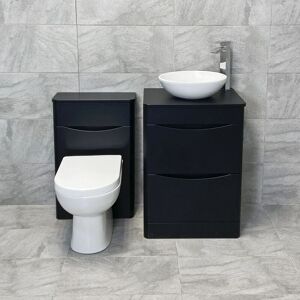 Vanity Bathroom Suite Satin Black with Toilet Unit Wok Basin and Tap Aegean 600mm floorstanding vanity unit Contemporary Handle-less design With 2 soft close drawers that can be used for storage With matching worktop Floorstanding Including Charlotte Wok style ceramic basin Including un-slotted basin waste Satin black finish Vanity Unit Sizes approx: Width: 610mm Depth: 450mm Height (To top of Worktop): 820mm Height (To top of Basin): 940mm With matching 500mm WC unit Floorstanding WC unit Includes concealed dual flush cistern with Chrome flush button Back to wall design to hide pipework High quality white gloss glaze Satin black finish WC unit sizes approx: Width: 510mm Depth: 200mm Height: 800mm With Echo 2 Rimless Back to Wall Toilet Pan & Soft Close Seat High quality ceramic High gloss glaze Rimless design for easy cleaning Modern styling Including soft close toilet seat With quick release mechanism – seat can be easily removed for cleaning Please note: new toilet pan design from