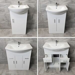 Hydros Mediterranean White Gloss Bathroom Vanity Unit (various sizes) features include: High gloss white finish Includes high quality 1 tap hole ceramic basin Unlike other listings our units come ready assembled (not flat pack) Modern designer contemporary styling Soft close doors Chrome finish designer style handles These units are great for creating extra storage space in the bathroom Keeps all your bottles, & cleaning products out of sight! Unit made from MDF, finished using high quality materials supplied by the paint manufacturers of Dulux Assembled using high quality German parts Manufactured in Europe Do not confuse our units with low quality Chinese imports that will fade in time due to inferior materials used during manufacture Tap and waste NOT included - can be purchased as an alternative option Available sizes (approximately) - images of each unit available below: 450mm Vanity Unit and Basin - W: 450mm x D: 400mm x H: 875mm 550mm Vanity Unit and Basin - W: 550mm x D: 435mm