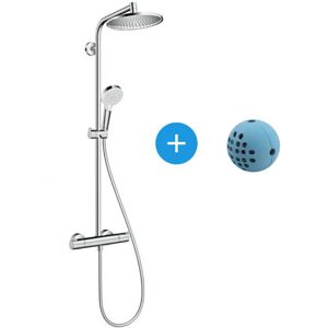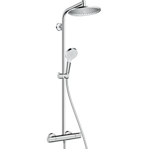 GENERAL DESCRIPTION The Crometta S 240 Shower column features a modern design and offers a great showering experience. It includes an overhead shower, hand shower, thermostatic mixer, shower hose, slider, and shower bar. The large overhead shower provides a refreshing rain-like experience. TECHNICAL SPECIFICATIONS Connection dimension: 1/2' Connection thread: G ½ Centre distance: 150 ± 12 mm Shower head size (overhead shower): 240 mm Shower arm length (overhead shower): 350 mm Shower bar diameter: 22 mm Flow rate (overhead shower at 3 bar): 16 l/min Flow rate (hand shower): Rain, IntenseRain Minimum operating pressure: 1.2 bar Maximum operating pressure: 10 bar Safety stop temperature: 40°C Weight: 6.33 kg Product type: Shower system COMPATIBILITY AND ACCESSORIES Includes: overhead shower, hand shower, thermostatic shower mixer, shower hose, slider, shower rail INSTALLATION Exposed installation allows for easy setup, with all components accessible outside the wall. USAGE The outlets