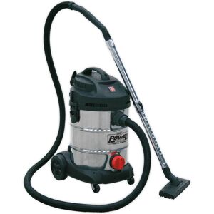 High powered, lightweight industrial unit with blower facility. Constructed from stainless steel, the drum unit is mounted on two castor and two fixed wheels. Tool storage points on head and base. Supplied with 4m cable with 3-pin plug, deluxe tool kit, including stainless steel telescopic rigid extension tube, cartridge filter and wet-use foam filter. Features & Benefits: • Powerful 1400W motor head gives incredible suction through Ø35mm hosing. • Blower facility. • 30L Stainless steel drum and telescopic rigid extension tube plus tools for wet and dry operations. • Tool storage points on head and base. • Designed for use with cartridge filter or dust collection bag (optional) for fast and clean disposal of waste. • Supplied with cartridge filter and wet-use foam filter. • Model No. PC300SD Specifications: Model No PC300SD Airflow: 120m³/hr Brand: Sealey Drum Size: 30L Filter Type: Cartridge Maximum Vacuum Pressure: 160mbar Motor Power: 1400W Nett Weight: 7.4kg Optional Accessories: PC300PB5 - Optional Dust Bags (Pack of 5) Replacement Parts: PC200CFL - Cartridge Filter, PC200FF10 - Foam Filters (Pack of 10) Supply: 230V Vacuum Accessories Diameter: Ø35mm