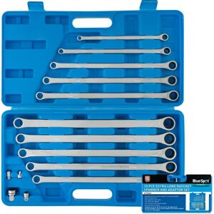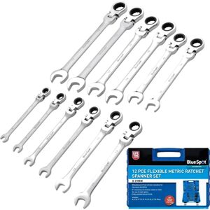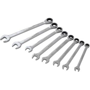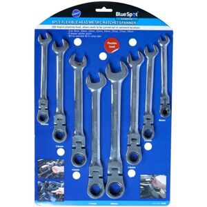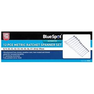 This Blue Spot set contains 8 Metric Ratchet Spanners which are made from Chrome Vanadium Steel. They have small, 8° ratcheting action, allowing them to be used in awkward or confined spaces where standard spanners may struggle. The set contains the following sizes:8, 10, 12, 13, 14, 15, 17 and 19mm. Bluespot Tools Ratchet Spanner Set, 8 Piece