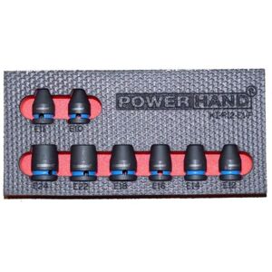 PowerHand 8pcs. E-Torx Impact Socket 1/2' Set in EVA Foam The PowerHand KI-R12-E1 is an 8-piece E-Torx impact socket set designed for 1/2' drive tools. This set is particularly useful for applications requiring high torque, such as automotive repairs and heavy machinery maintenance, where E-Torx fasteners are prevalent. Key Features: Material and Durability: Each socket is constructed from chromium-molybdenum (Cr-Mo) steel, known for its strength and resistance to high-torque applications. Size Range: The set includes the following E-Torx sizes: E10, E11, E12, E14, E16, E18, E22, and E24, covering a broad range of common fastener sizes. Color-Coding: Sockets are color-coded for easy drive identification, simplifying the selection process during use. Storage and Organization: The set is supplied with a rail for convenient storage, ensuring that each socket is securely held and easily accessible. Applications: Ideal for professionals and enthusiasts working with vehicles or machinery