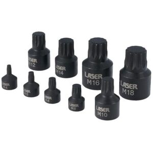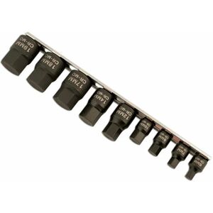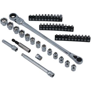 1/4""D, low profile bit set including Hex, Spline and Star* bits, with ratcheting 12mm bit driver spanner. 14 x socket bits: Hex 4, 5, 6, 7, 8, 10mm; Star* T27, T30, T40, T45, T50; Spline M5, M6, M8, M10. 4 x 1/4""D single Hex sockets: 7, 8, 10, 12mm. Sockets include locking ring for use with supplied ratchet spanner. Ideal for car door hinges and for use where space is restricted. 1/4""D or 12mm drive. Bit manufactured from chrome molybdenum, sockets from chrome vanadium.