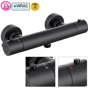 This high quality solid brass WRAS TMV2 approved thermostatic exposed shower mixer in a stylish black matte finish. This thermostatic shower mixer bar valve allows you to halt or control the flow of your shower whilst the thermostatic control gives complete temperature performance, suitable for any modern bathroom. Works on all conventional plumbing systems (min pressure 0.2 Bar) With its ultra clean lines and minimalist styling, This Matte Black mixer shower is more than a shower. It s a statement. Your statement. Whether you re out to enhance a coloured interior, or complement your very own oasis of calm, this shower will help you reflect just the right mood. Using WRAS approved showers offer you the peace of mind that every component in the shower has been rigorously tested to meet the highest quality standards. You can find more information by visiting the WRAS website Valve only - No Riser Rail, hose or head Included Industry Standard 150mm Centres so an ideal replacement for