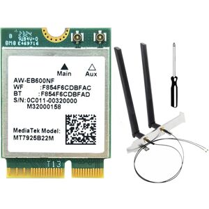 Wireless Technology:802.11A/B/G/AC/AX/BE Built-in Bluetooth:5.3 Bluetooth Product Interface:NGFF M2 Fast and efficient:-MIMO technology Product Model:MT7925 Wireless Speed: 2.4G/574Mbps 5G/2400Mbps 6G(160MHz)/2400Mbps Supported systems: For Win10, Win11 For Openwrt. (Linux. Openwrt. these 3 systems are not technically supported) Colour:As Shown Material:PC Due to different batches, there may be differences in product appearance and printed text, which not affect use Package Contents: 1 * WiFi Card 1 * Screwdriver(Color and appearance are random, don't accept the specified color and appearance) 2 * External Antennas with Baffles Only the above package content, other products are not included. Note: Light reflection and different displays may cause the color of the item in the picture a little different from the real thing. The measurement allowed error is +/- 1-3cm.
