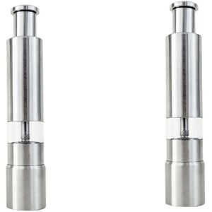 1. The pepper mill dispenses spices quickly and easily, press the top to grind pepper in a simple, one-handed way, unscrew the bottom for refilling. 2. Easy to use and easy to clean. 3. Visible window designed so the remaining amount can be seen at a glance, and the wide filling hole allows easy access to salt and pepper. 4. Suitable for grinding pepper, corn, mustard and other small spices. 5. Perfect gadget for making freshly ground pepper powder spices to enjoy a salad or a tasty steak. Color: Silver Material: Stainless steel Size: 15cm Package Contents: 2 x Grinder Only the above package content, other products are not included. Note: Light reflection and different displays may cause the color of the item in a little different from the real thing. The measurement allowed error is +/- 1-3 cm.