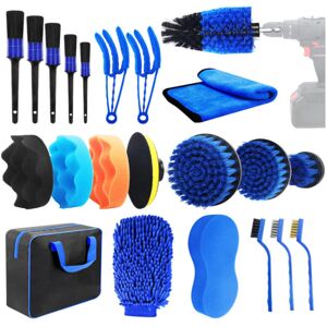 22PCS Car Detailing Brushes The car detailing brush kit includes 5 x car detailing brushes, 4 x drill brush, 3 x polishing sponges, 3 x wire brush, 2 x air conditioning brush, 1 x drill adapter, 1x microfiber glove, 1x microfiber car towel, 1x car sponge, 1x handbag. The car cleaning brush set contains a wide range of different accessories, to meet all your cleaning needs. Moderate Hardness Car Detailing Brushes, PP + Nylon The car detailing kit set has a nice hardness, not too hard or too soft. With 5 sizes of car detailing brushes, you can reach every small corner of the car interior when cleaning the car. For cleaning car floor mats, car seat, steering wheel, etc., effortlessly shakes off dust, dirt and pet hair. 4 PCS Drill Brush Kit, PP + Nylon Comes with different sizes/shapes, especially the longer pointed drill brush, you can use the brush to get into the gaps of the rim to clean the rims more cleanly and effectively. In addition, the drill brushes have the optimal degree of