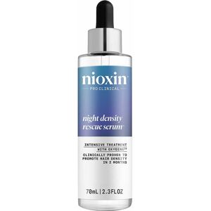 Nioxin 70ml Night Density Rescue Serum is a proven overnight treatment designed to promote the appearance of thicker hair in just 2 months*. This Night Density Rescue Serum works its magic while you sleep, making it an effortless addition to your hair care routine. Simply apply this leave-in treatment before bed, and let it work its wonders while you rest. Quickly absorbing into the scalp and hair, the lightweight and non-greasy formula leaves no residue behind. Key Ingredients Include: Formulated with a blend of powerful ingredients like ginger, lauric acid, and caffeine to help promote thicker, fuller hair overnight. Ingredients: Alcohol Denat., Aqua/Water/Eau, Niacinamide, Caffeine, Sandalore, Parfum/Fragrance, Lauric Acid, PEG-40 Hydrogenated Castor Oil, PEG-35 Castor Oil, Alpha-Isomethyl Ionone, Hexyl Cinnamal, Limonene, Alcohol, Linalool, Tocopherol, Citric Acid.