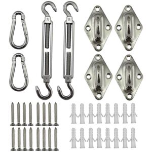 The awning fixing kit is made of high quality 304 stainless steel. High load capacity, sturdiness and durability, good corrosion resistance, simple installation and special smooth surface technology improve corrosion resistance and fading performance. The strong structure of the thick material can produce greater load-bearing capacity to keep the sunshade stable in wind and rain. First install the wall brackets on a solid place such as wall/pole, then choose different accessories (adjustable turnbuckle, carabiner, S-hook) for installation according to different positions where the shade sail is connected. Tensioner(150-220mm) x 2 Wall mounting parts x 4 Carabiner x 2 S-shaped hook x 2 Screws x 16 Expansion screws x 16 Shade sail fixing kit 42 pieces How to install: Package contents: