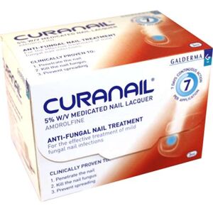 Curanail 5% Nail Lacquer is an effective antifungal treatment specifically formulated to combat mild fungal infections affecting up to two fingernails or toenails. The active ingredient, amorolfine, is a powerful antifungal agent that works by preventing the growth and spread of fungal infections, helping to restore healthy nails over time. Unlike many other treatments, Curanail is applied directly to the affected nail as a medicated lacquer, allowing for targeted treatment without the need for oral medication. This once-weekly application provides a convenient solution for those struggling with onychomycosis (fungal nail infections). The lacquer penetrates the nail plate to reach the site of infection, working to eliminate the fungus and prevent further spread. As the nail naturally grows out, the healthy nail replaces the infected portion, resulting in visibly improved nail condition. Curanail 5% Nail Lacquer dries quickly, leaving an invisible protective layer on the nail, which continues to release the active ingredient over time. The pack includes cleansing swabs, reusable applicators, and nail files to ensure proper application and hygiene. With consistent use, Curanail can help restore nails to a clear, healthy state, making it an ideal solution for mild fungal nail infections.