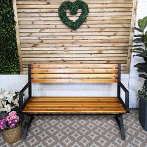 Relax in your garden in style this year with this park style bench. Suitable for the patio, garden or a balcony. This 2 seater bench is made of quality fir wood and constructed with a powder coated steel Black modern cross style frame ensuring durability and stability for years to come. The slatted design works well for any setting making it ideal for anywhere in your garden to enjoy the outdoors. The bench comfortability sits 2 people with it's spacious seat area and the back rest provides plenty of support giving you a relaxing, comfortable sitting posture. Self assembly required. Max weight 220kg Dimensions Seat H: 42cm Back rest H 18cm Seat L: 120cm Seat W 40cm Arm rest L: 35cm Total H: 86cm Total L: 131cm ClassicLiving