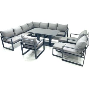 This deluxe aluminum adjustable rising sofa dining set is a great addition to your patio or garden, made of high quality Alloy aluminum and powder coating for sturdiness and structural durability. Set Dimensions: • 1 x Left Sofa with single armrest: 125W x 70D x 78H cm • 1 x Right Sofa with single armrest: 125W x 70D x 78H cm • 1 x Corner Sofa:70L x 70W x 78H cm • 2 x Armless Sofa Size: 60L x 70W x 78H CM • 3 x Chair: 74L x 70W x 78H cm • 2 x Fully Assembled Stool: 40L x 40W x 36H CM • 1 x PC Adjustable dining table : 140L x 80W x 48/70H cm (Low 48cm Height 70 cm With Black Tempered Glass) Dark grey powder coated with dark grey fabric .Color may vary little due to light or monitor .we are unable to return the item due to color problem .please contact us before purchase if you have requirement on color saturation. Table can stop at any height between 48-70 cm .Cheap Price Compared With Other On or Offline Store For Rising Table Set Items Comes Flat Pack And Easy Assemble, Alloy