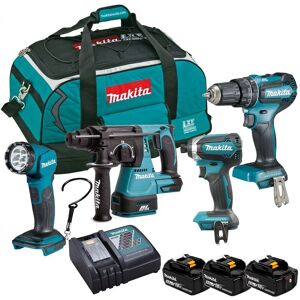 The Makita 4-piece lithium-ion LXT Combo kit includes a combi drill,impact driver, SDS rotary hammer drill, LE torch, 3 x 5.0Ah Li-Ion batteries and a Rapid Battery Charger in a Heavy Duty Canvas Tool Bag. Models in Kit: DHP483 - 18v LXT Combi Drill DTD153 - 18v LXT Impact DriverDHR242 - 18v LXT Rotary Hammer Drill DML815 - 18v LXT Torch DC18RC - 18v Charger3 x BL1850 - 18v 5.0Ah Batteries Features of the Makita DHP483: Brushless Motor Keyless chuck for one-hand operation and spindle lock XPT - Xtreme Protect Technology. Optimal protection against dust and splash water even under harsh conditions Lithium-ion powered Twin LED Job light with after-glow function 50Nm Max lock torque Mechanical 2 speed gearingNo Battery or Charger Supplied Features of the Makita DTD153: Brushless motor One touch sliding chuck for easy bit installation and removal. LED job light Ergonomic soft grip Electric brake Variable speed control by trigger Forward/reverse rotation Compact overall length. Features of
