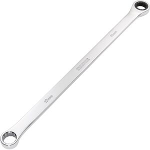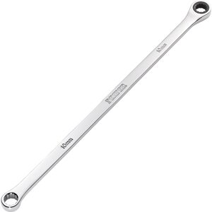 Description This HI-TORQ® metric extra-long double ring ratchet spanner is designed for enhanced leverage and accessibility. Made from hardened, tempered chrome vanadium steel, it is fully polished and mirror chrome plated for corrosion resistance. The extra length allows easier access to hard-to-reach areas, while the 90-tooth ratchet mechanism provides a 4° swing for efficient use in tight spaces. Both ends are 12-point HI-TORQ® rings that maximize torque transfer to prevent slipping and damage to fasteners. Technical Specifications Size: 12mm Material: Chrome vanadium steel Finish: Mirror chrome plating Ratchet mechanism: 90 teeth, 4° movement Type: Double ring and fixed end spanner Compatibility and Accessories Compatible with standard 12-point fasteners Designed for use with HI-TORQ® fasteners for maximum torque transfer Installation No installation required; ready to use out of the box Usage Use to tighten or loosen nuts and bolts in hard-to-reach areas Ideal for automotive,