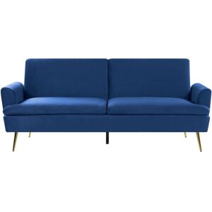 Glam Velvet 3 Seater Sofa with Golden Legs. The clean modern design of this sofa is sure to complement a living room in every style. During the day it offers comfortable chilling area for 3 people. When the evening arrives just use the easily unfolding click-clack mechanism and enjoy plenty of sleeping space. The sofa bed is thoroughly upholstered in smooth velvet fabric in a modern navy blue shade. Tapered metal legs in a gold finish gives an extra glam look to the piece. Details: Product Type: Sofa Bed Style: Modern General Color: Blue, Gold Shade: Navy Blue Material Type: Fabric Main Material: Velvet Additional Material: Metal Filling Material: Foam Material Composition: 100% Polyester Arm Style: Flared Leg Caps/ Pads: Yes Reclining: No Removable Cushion Covers: Yes Seat Construction: Sinuous Springs Seats Up To: 3 People Sleeper Function: Yes Sofa Bed Open Mechanism: Click-Clack Storage: No Dimensions: Armrests Height: 61 cm Depth: 84 cm Seat Thickness: 11 cm Seat Height: 50 cm